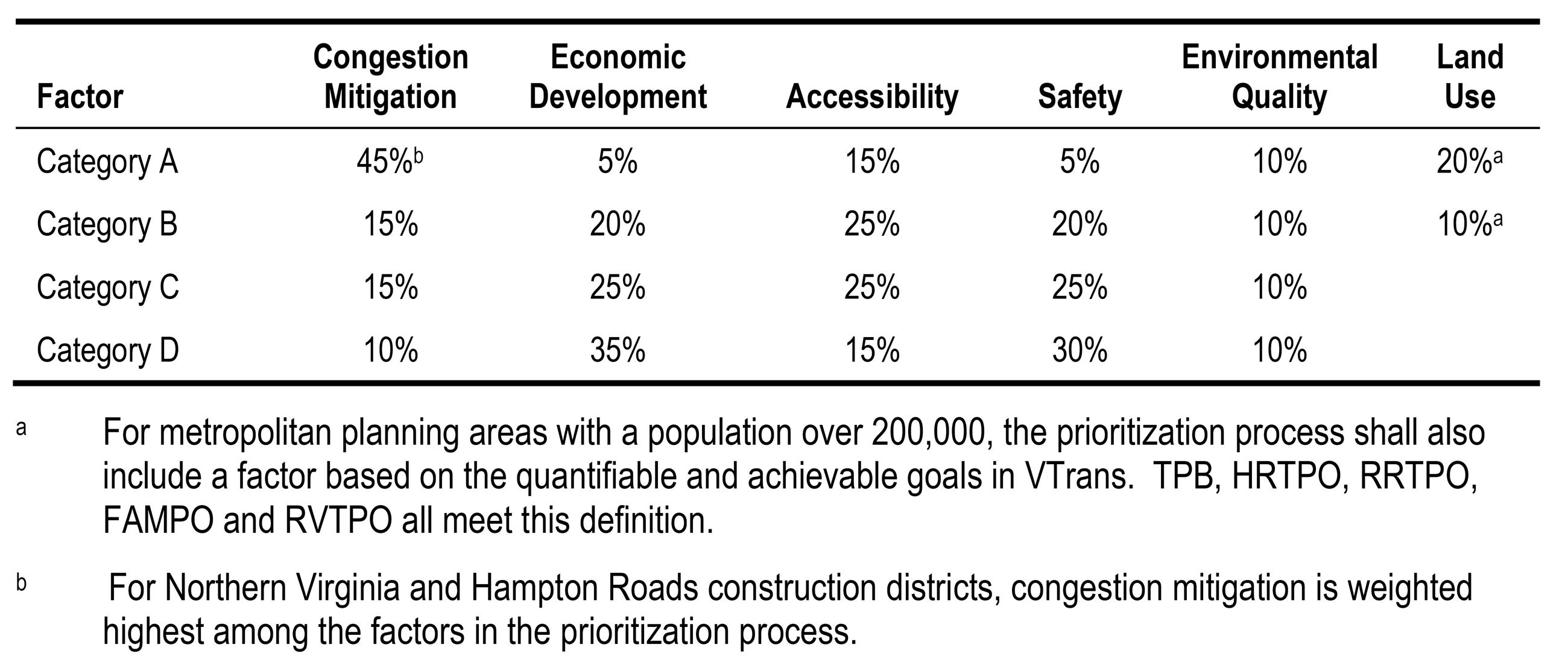 The legislation that resulted in SMART SCALE specifies that the CTB shall weigh the evaluation factors for each of the state's nine VDOT Construction Districts, assigning different weights to the factors based on the unique needs and qualities of each District. The figure below shows the SMART SCALE weighting typologies, or frameworks, for the nine construction districts. Several of the construction districts have more than one SMART SCALE weighting typology.